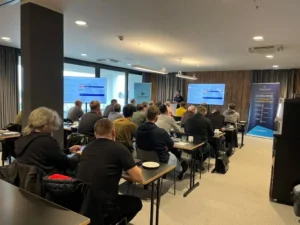 PEAKPLAN Teamleader Tomáš Vařecha uprostřed své přednášky pro instalační firmy v rámci akce PEAKPLAN Tour v březnu 2024.